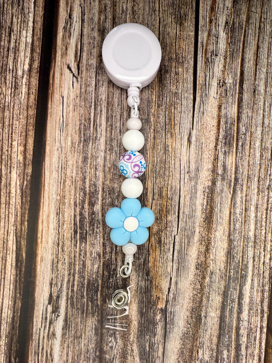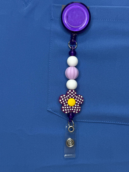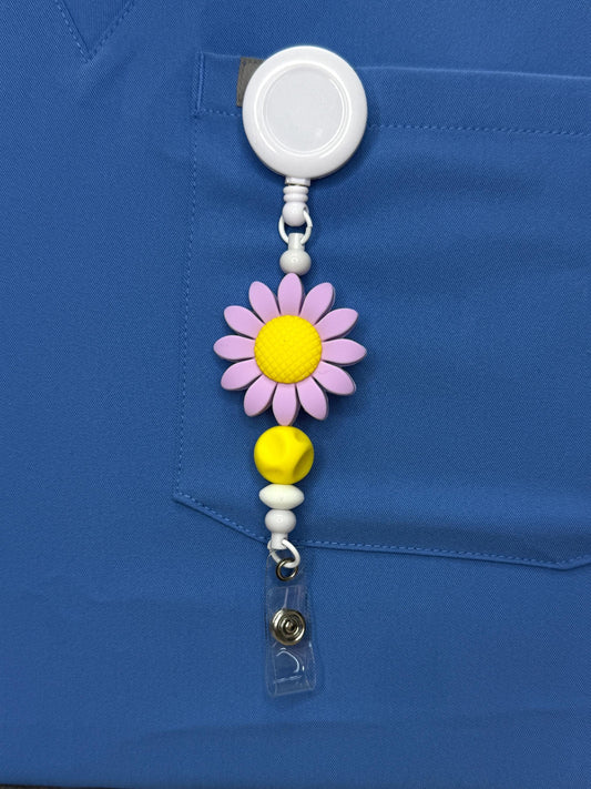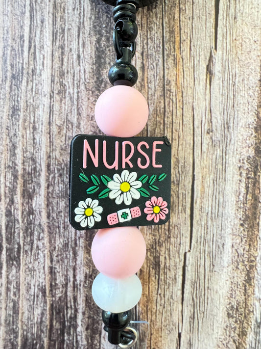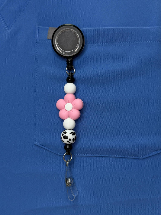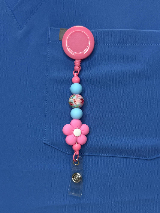 Beaded Nurse Badge Reel: Five-Petal Flower, Retractable ID Holder