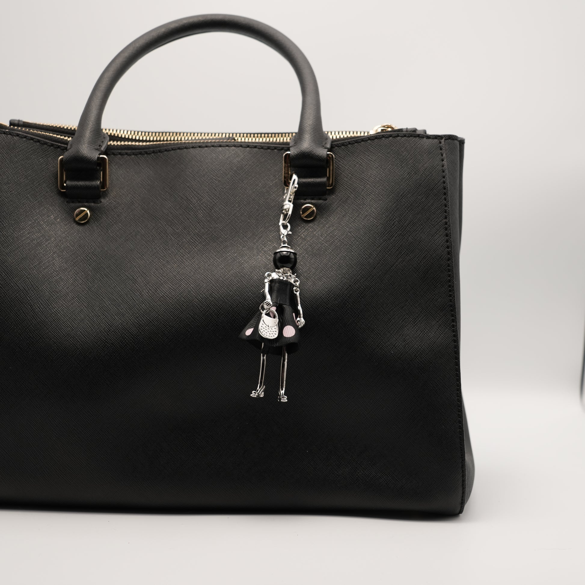 Elegant black with pink dots Bijou Doll purse charm. A collectible bag accessory that adds a touch of whimsy to any handbag, backpack, or tote. Perfect gift for her.