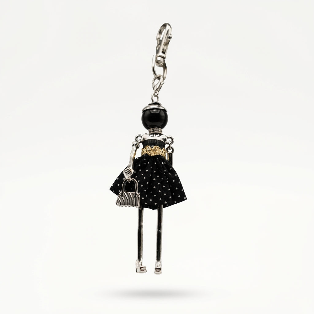 Elegant black with white dots Bijou Doll purse charm. A collectible bag accessory that adds a touch of whimsy to any handbag, backpack, or tote. Perfect gift for her.