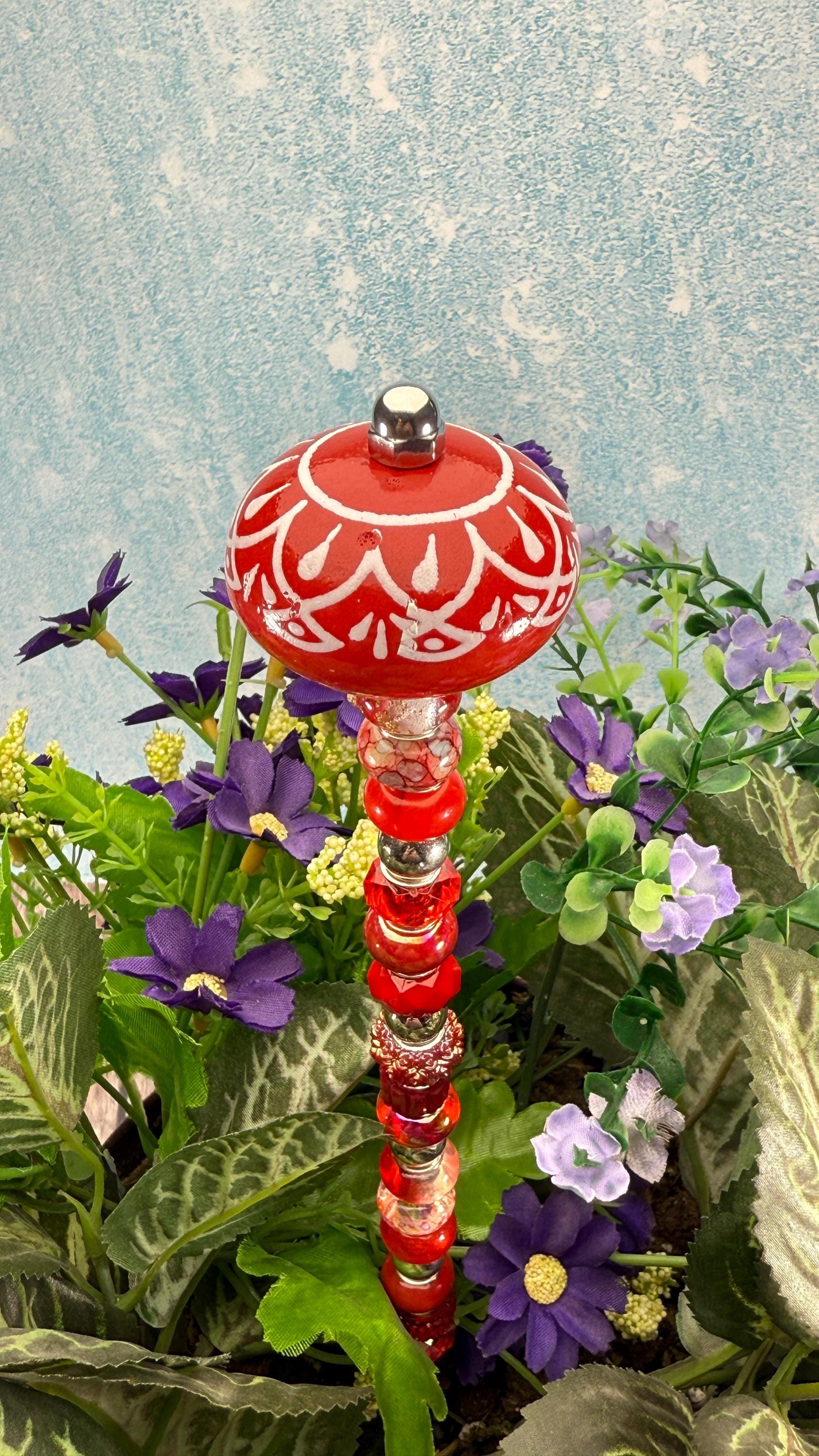 Fairy Garden Suncatcher Stakes – 15” Beaded Plant Decor with Red Ceramic Topper