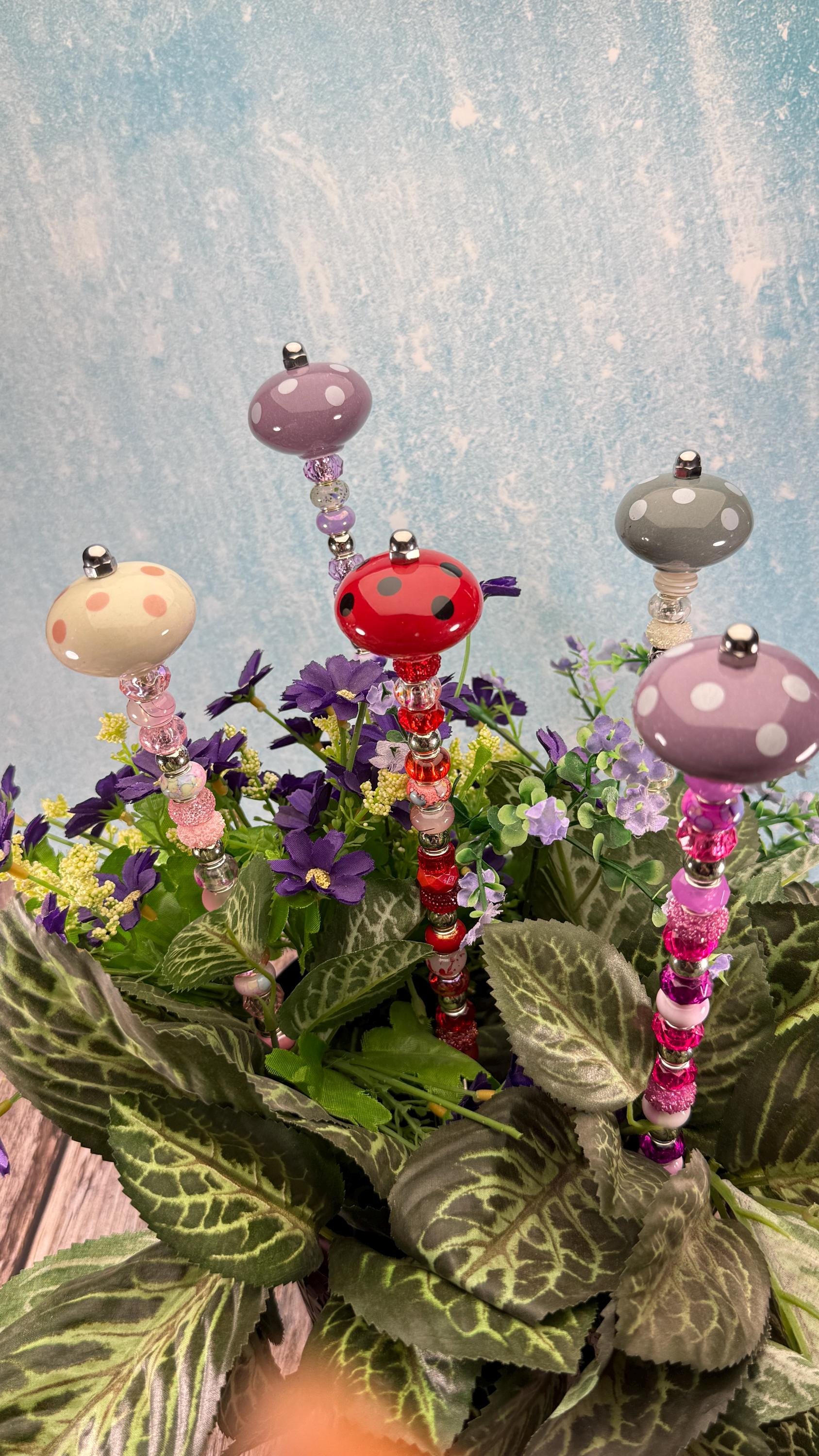 Add a touch of sparkle and whimsy to your garden, patio, or indoor plants with these handmade Fairy Garden Suncatcher Stakes. Each 15-inch stake is topped with a whimsical polka dot ceramic topper. Each stake is gorgeously accented with 19 hand-strung beads in coordinating tones. No two are alike—each is a miniature piece of garden jewelry that catches the sunlight and brings your plants to life.
