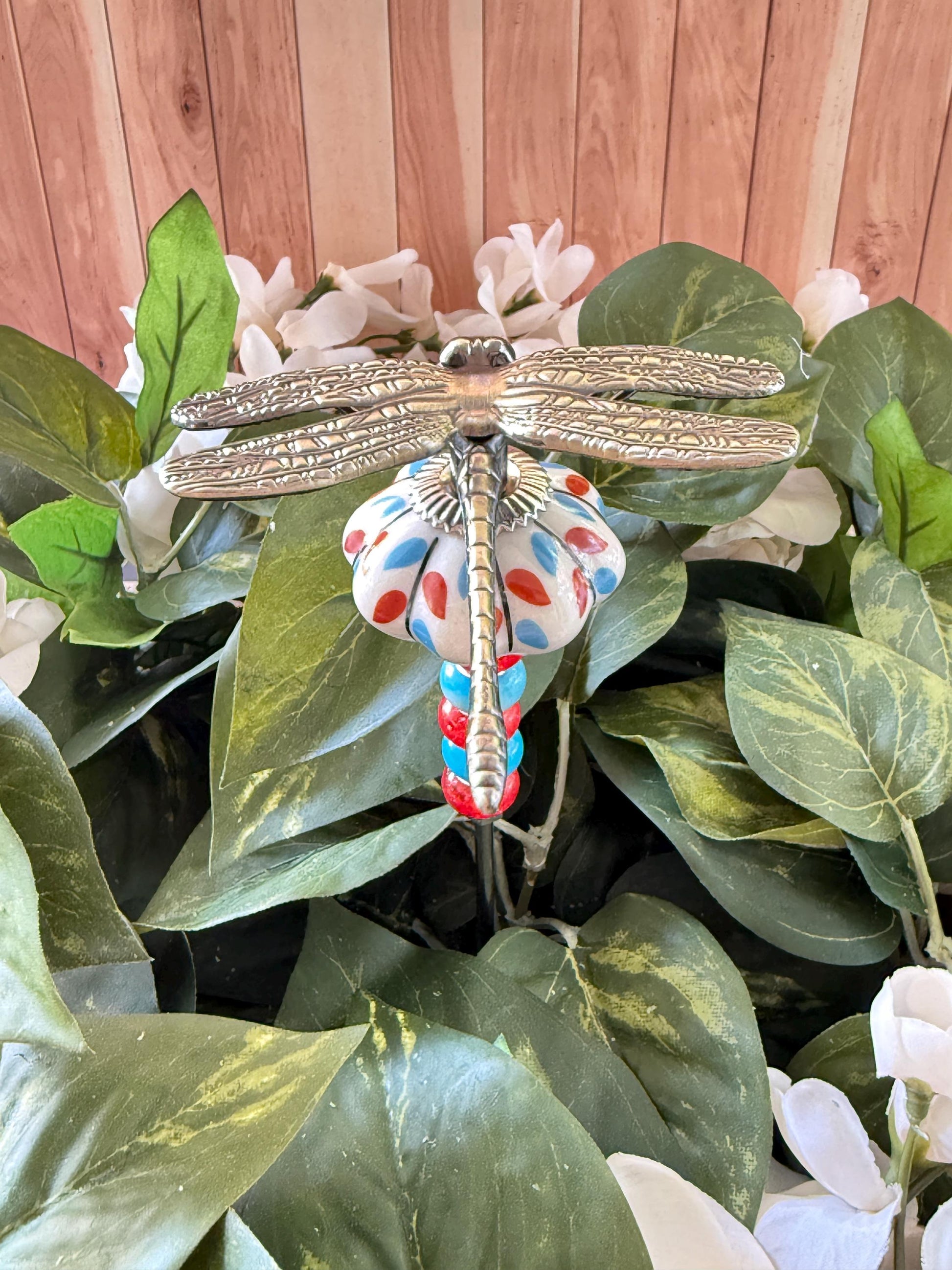 Giant Dragonfly Garden Suncatcher Stakes – 10” Beaded Plant Decor with Ceramic Mushroom and metal bug topper