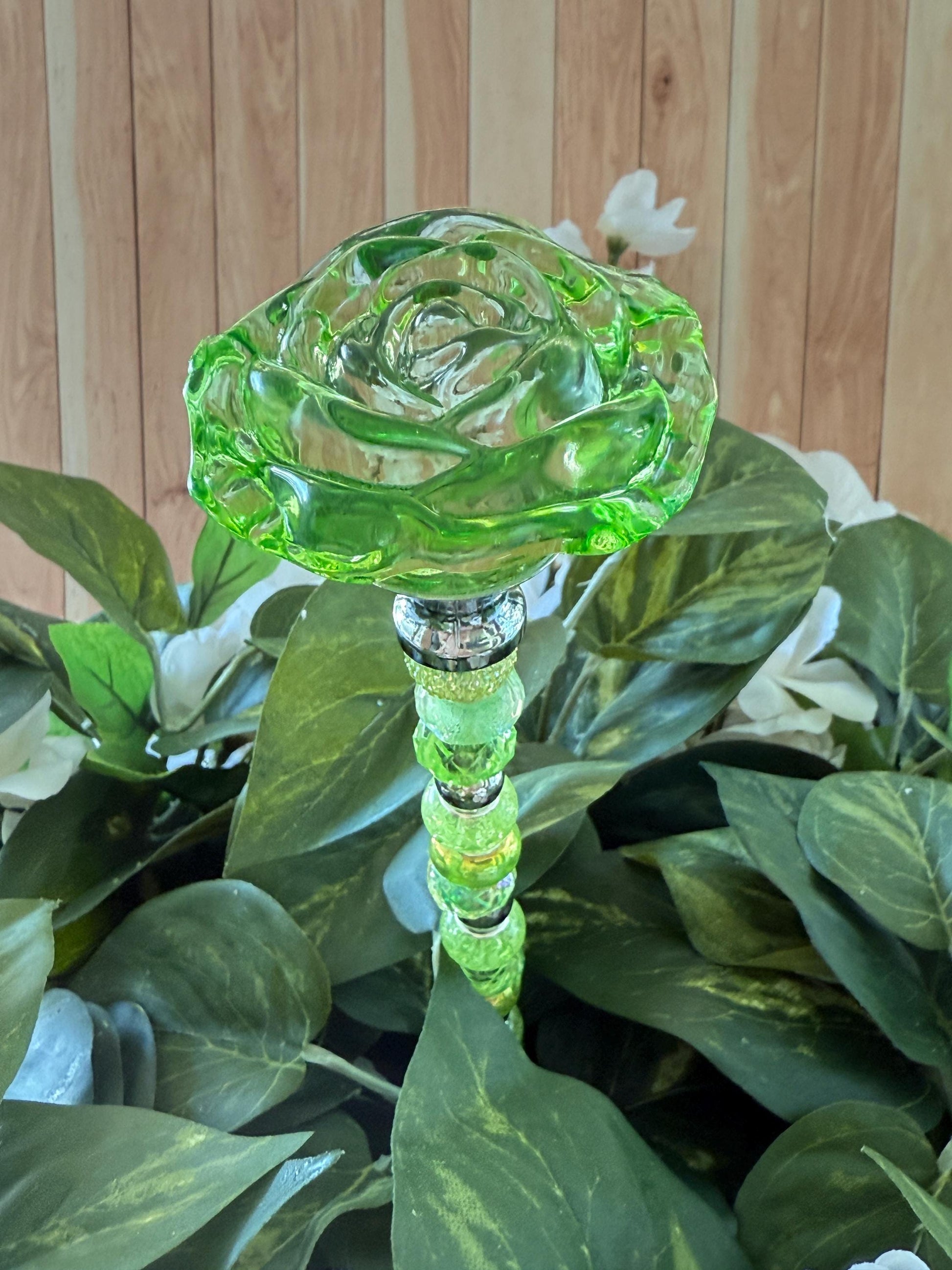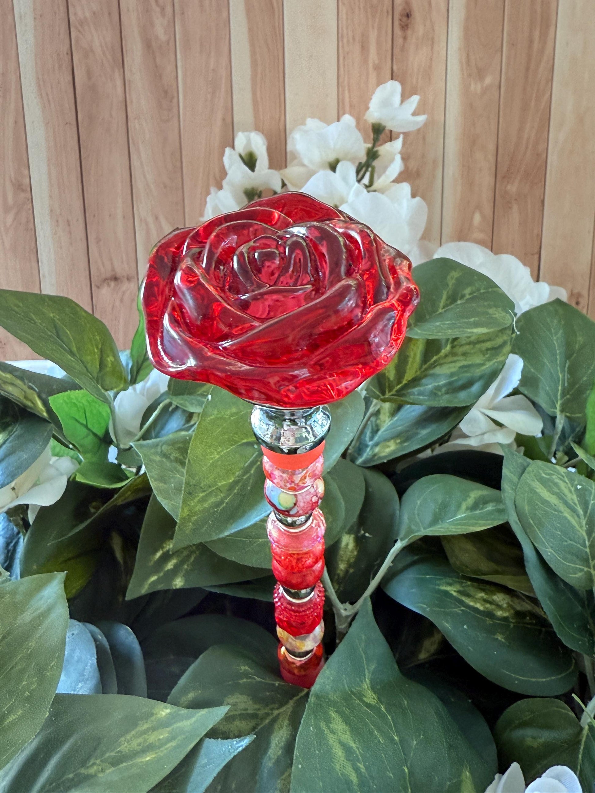 Giant Rose Fairy Garden Suncatcher Stakes – 15” Beaded Plant Decor with Glass Topper