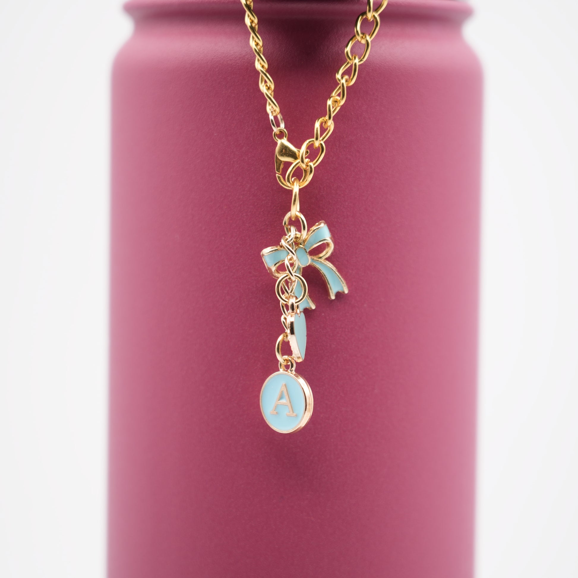 Beautiful handcrafted gold bow monogram charm in turquoise. Perfect accessory for your tumbler or bag!