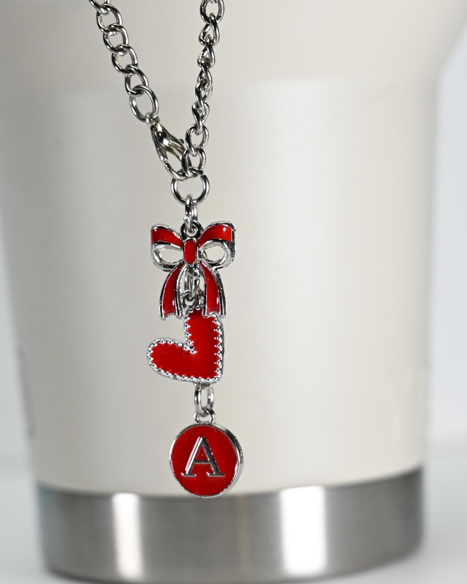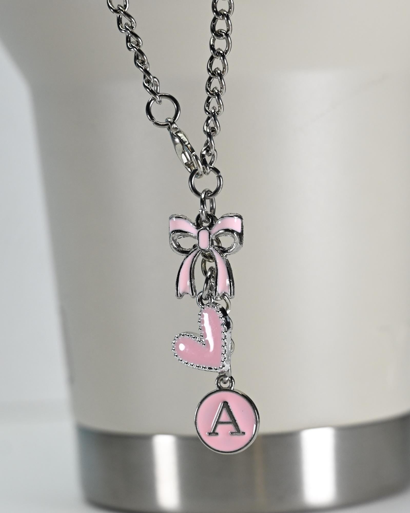 Dress up your tumbler, tote, or purse with our Monogram Charms — a stylish set of three enamel charms on a silvery chain. This set includes a dainty bow, a sweet heart, and your chosen initial (A–Z), all in a matching enamel color for a perfectly coordinated look.