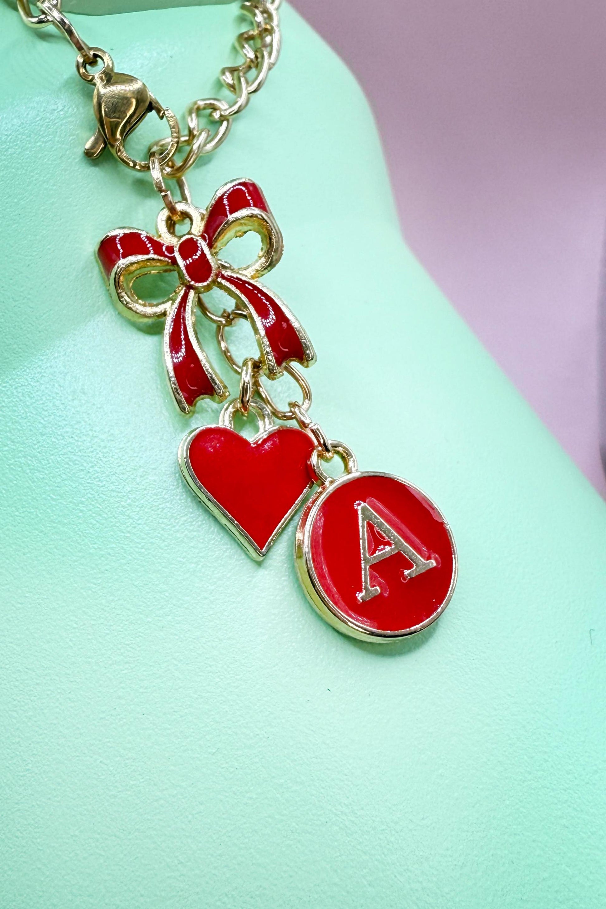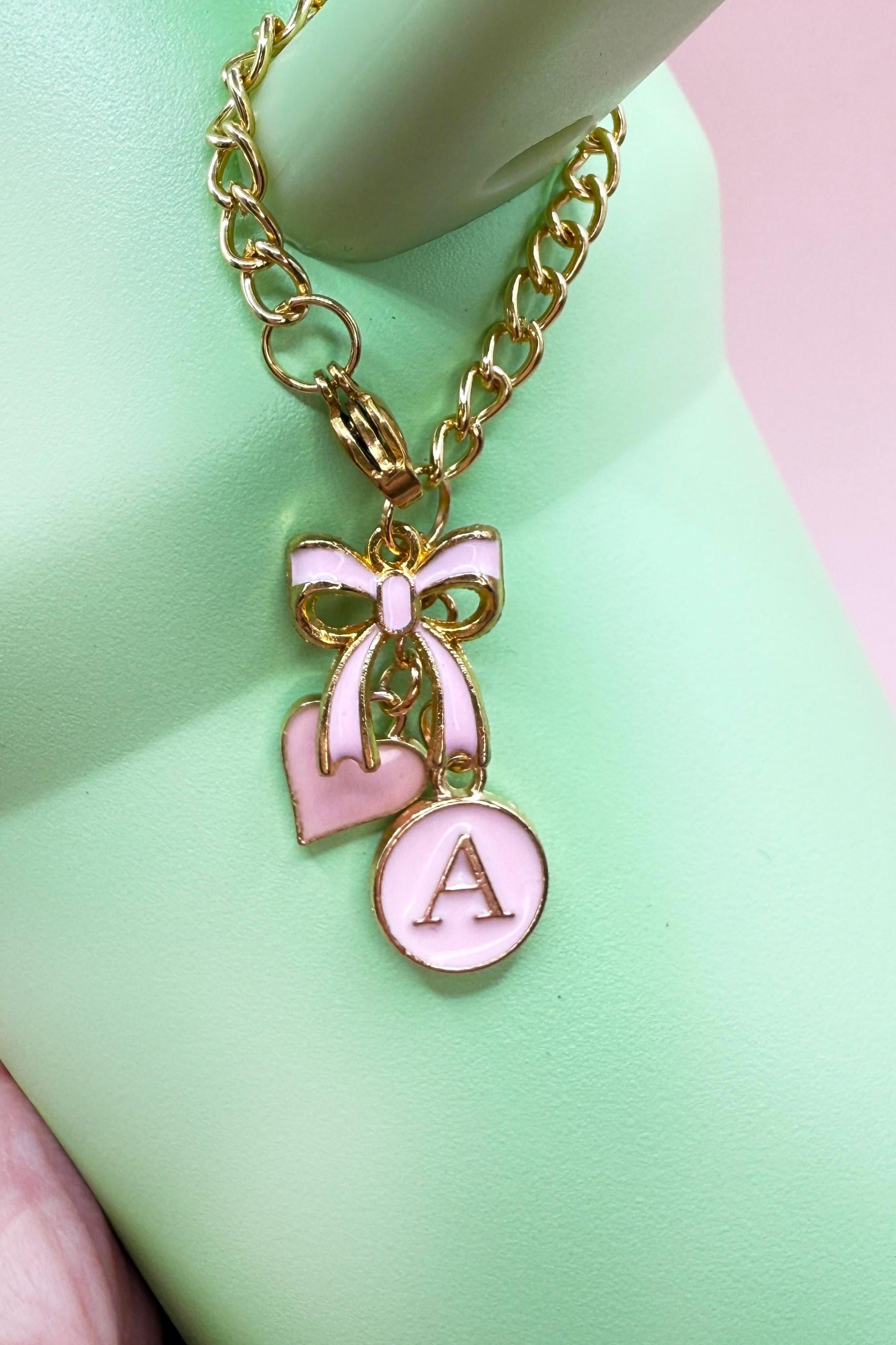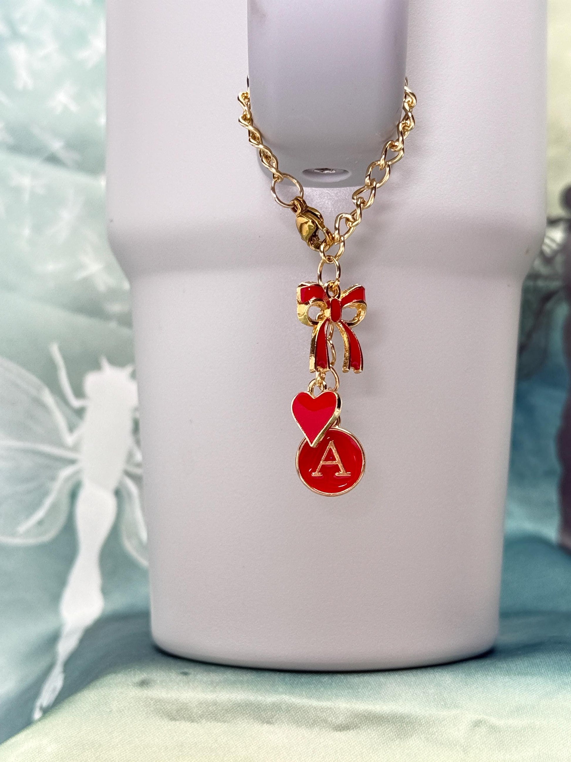 Add a personalized, elegant touch to your Stanley, Yeti, or Hydro Flask with this Custom Initial Tumbler Charm. Featuring a dainty gold-tone chain (3β), this charm includes a delicate enamel bow, a dainty heart, and a custom letter charm (A-Z), all beautifully finished in your choice of 6 trendy colors with gold accents. Whether you love soft, feminine pastels or bold, classic shades, this charm is a perfect way to add style, personality, and charm to your drinkware.