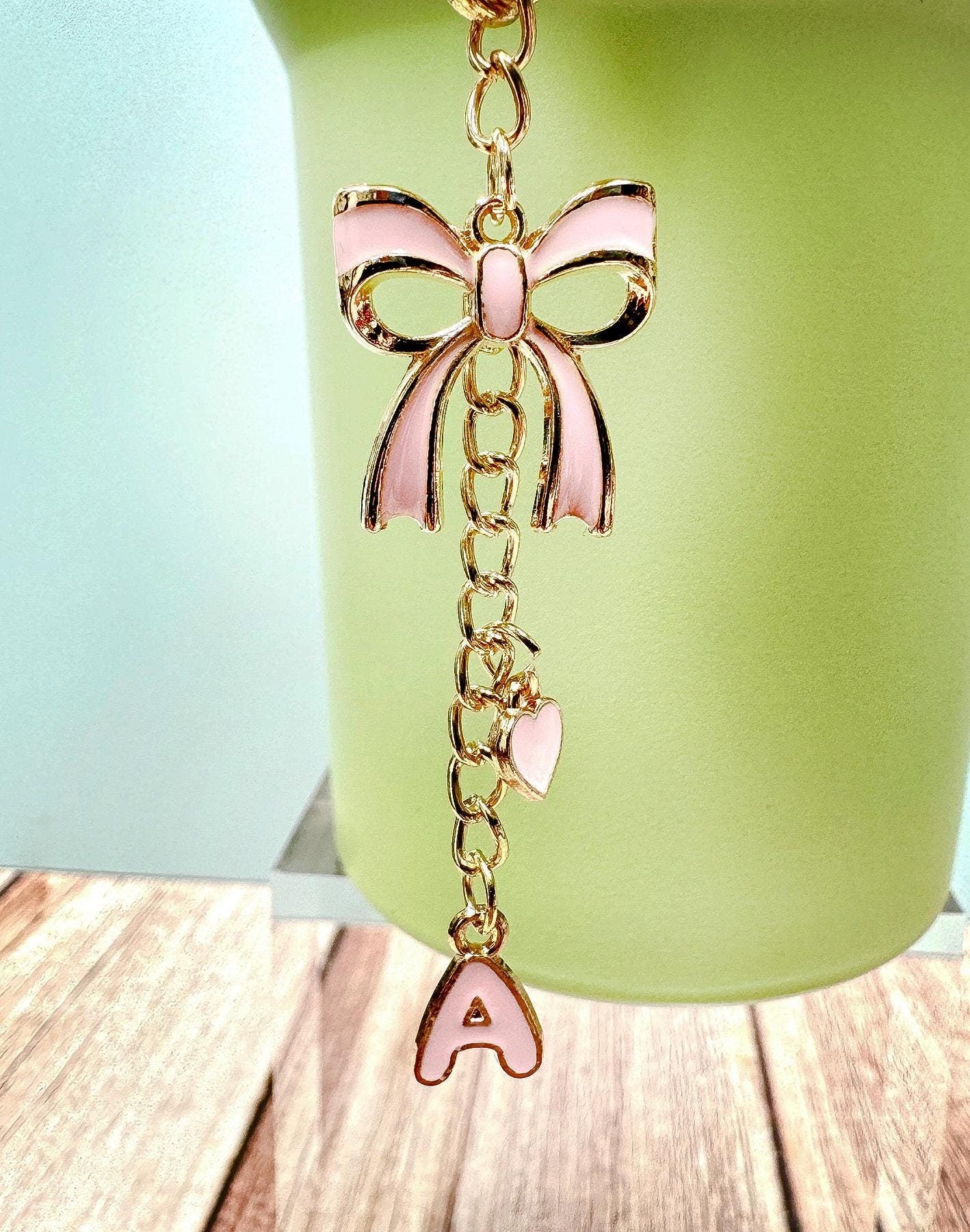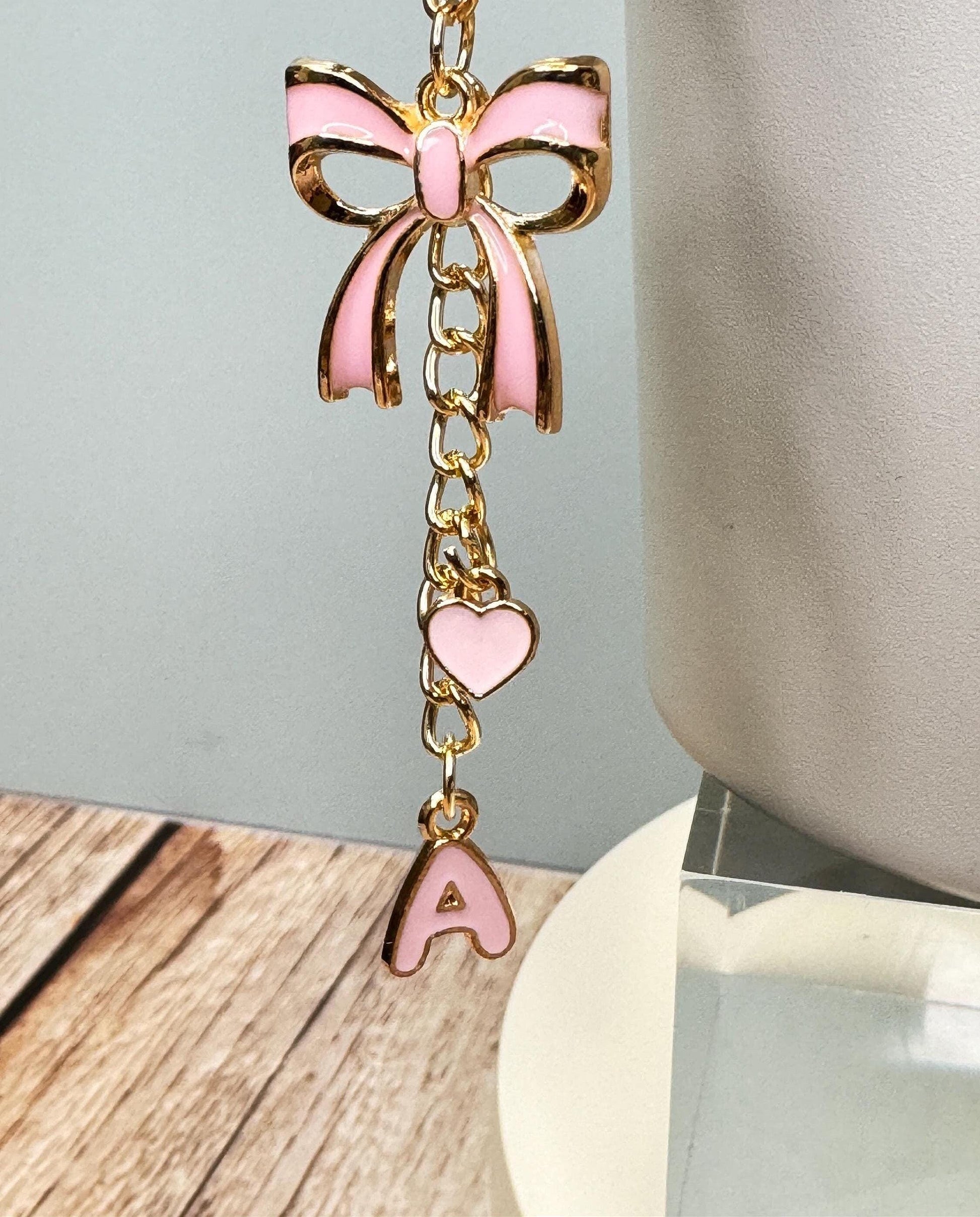 Product Details: • Includes 3 charms: Bow, Letter or initial), and small Heart • Easily clips around your tumbler handle • Available soft pink enamel • Compatible with Stanley, Yeti, Hydroflask and most tumbler handles • Perfect for personalizing your drinkware including wine glasses and stemware• Colors may vary slightly due to screen settings
