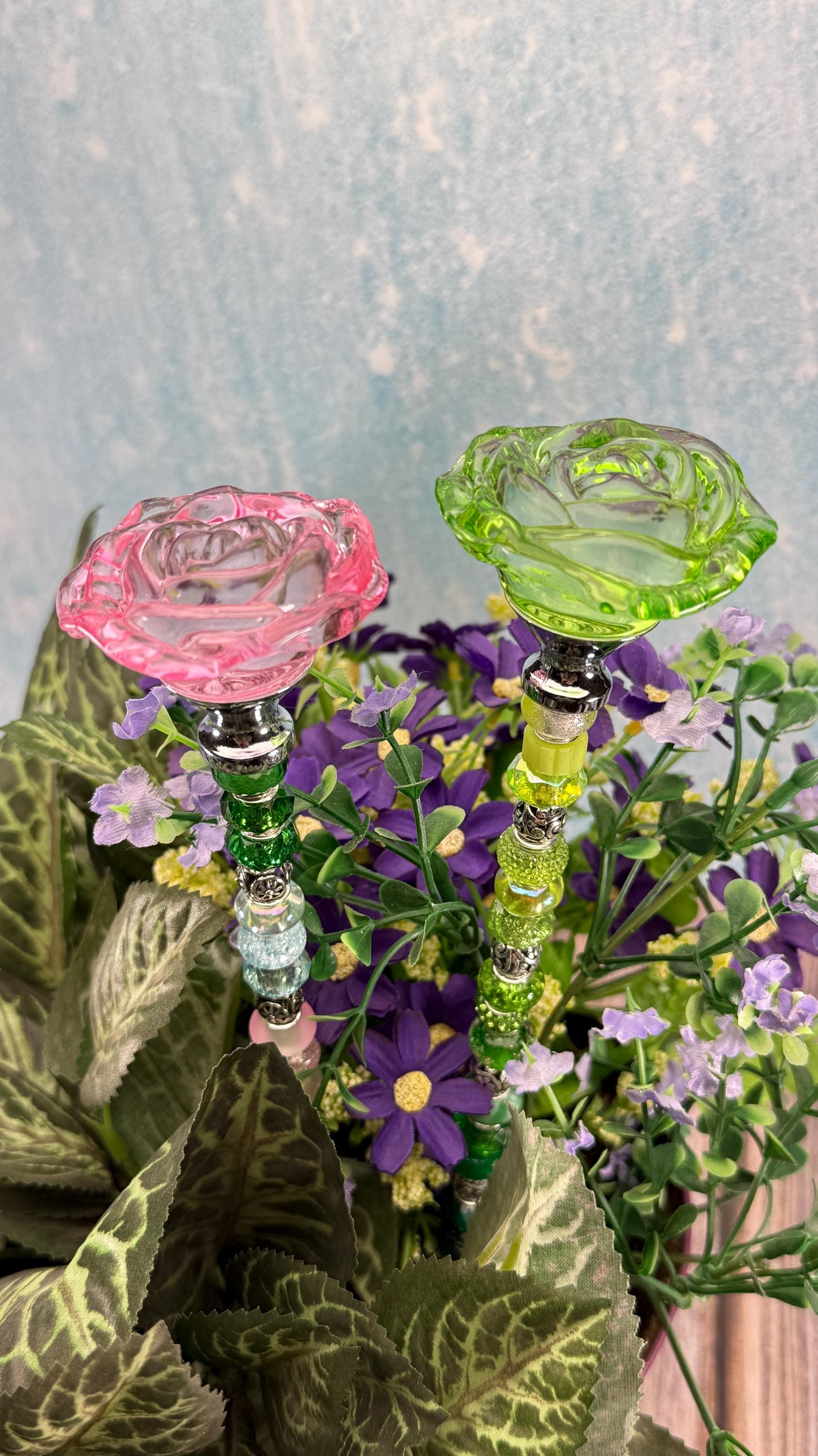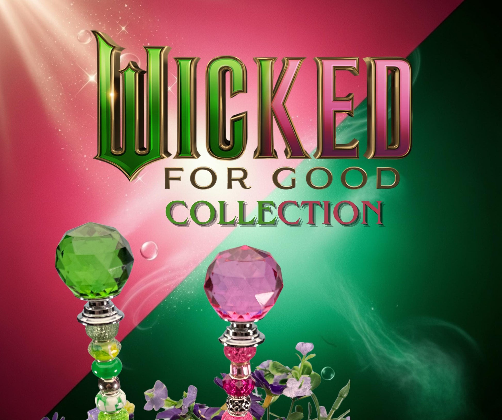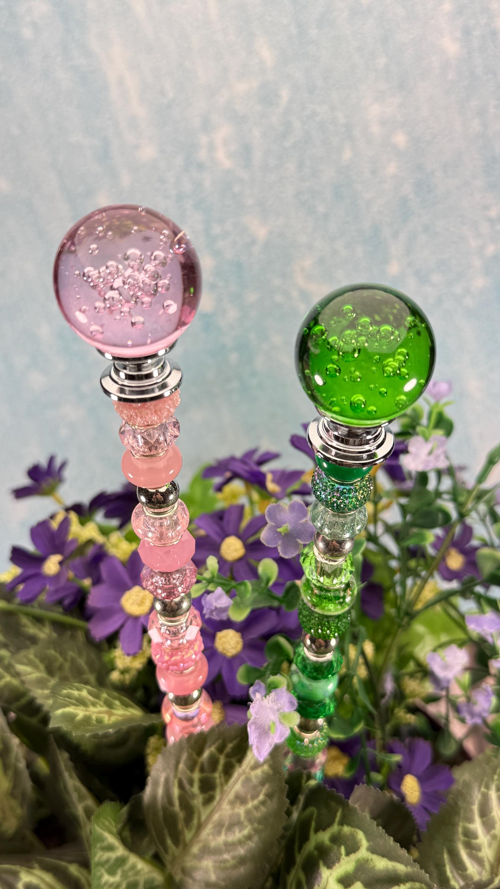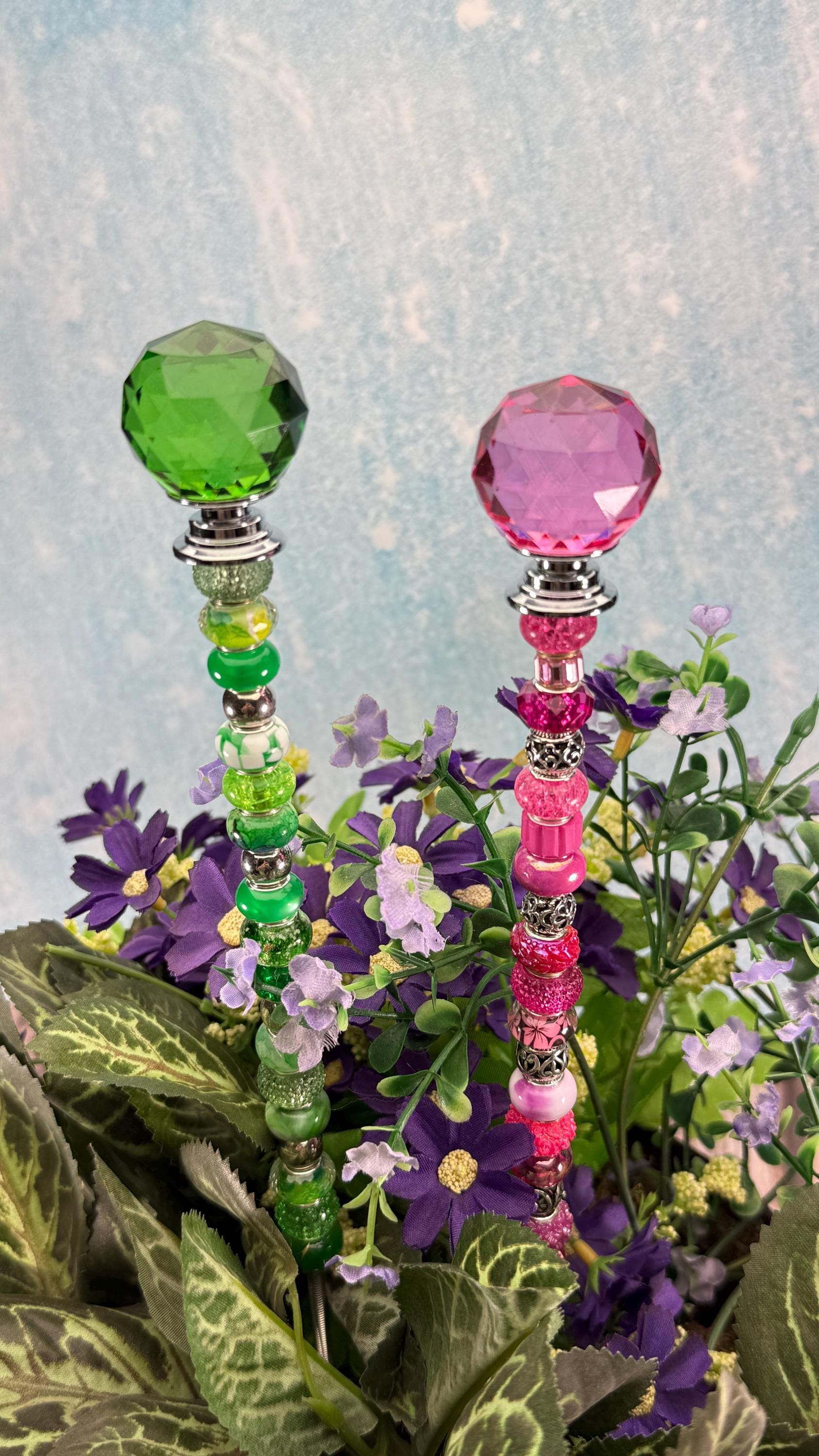 This enchanting Wicked Garden Stake Bundle includes two handcrafted stakes — one in Glinda pink and one in Elphaba green. Perfect for adding a touch of whimsy to your garden, potted plants, or fairy display.